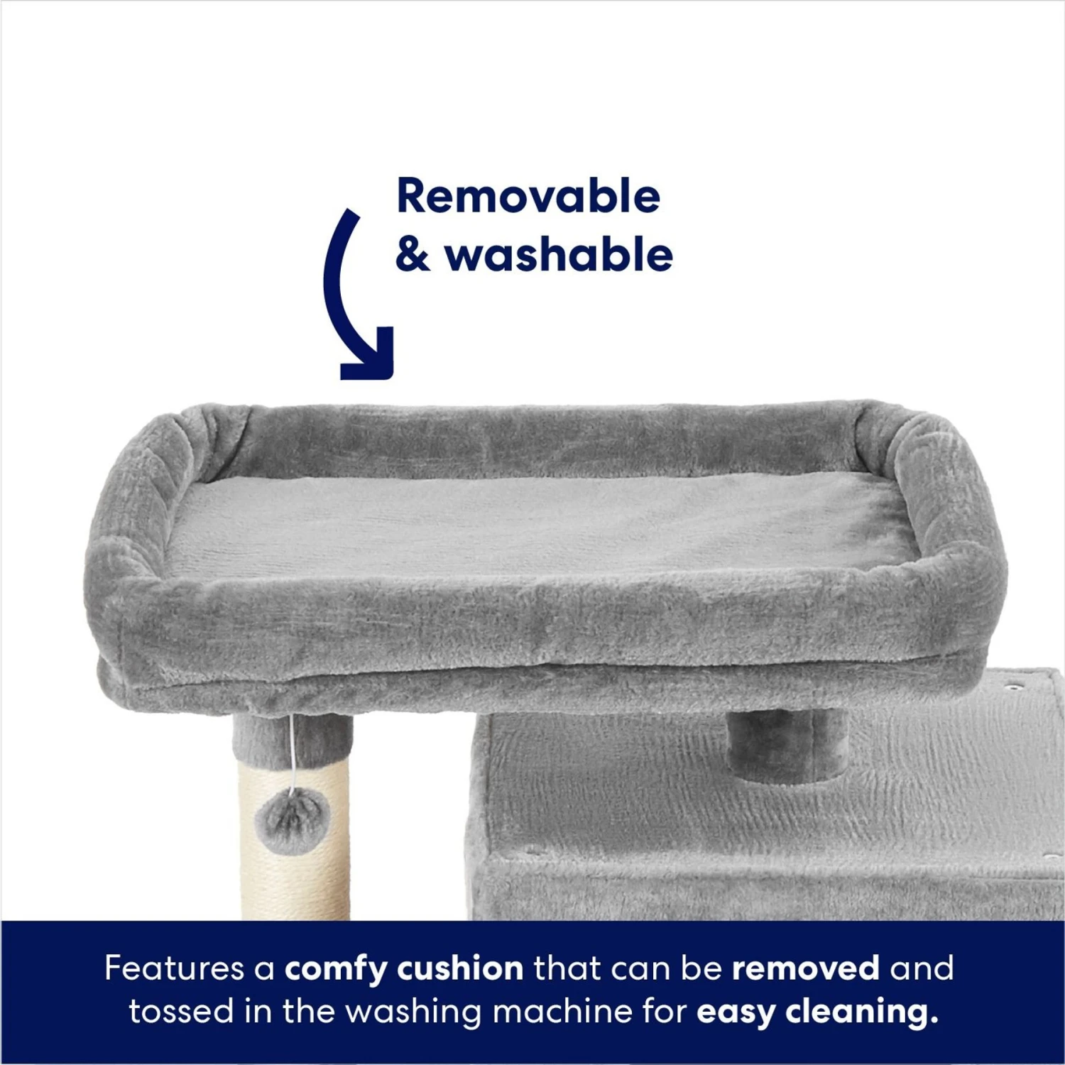 - Includes two condos, an extra-large top perch with removable, machine-washable bolstered bed, and sisal-wrapped scratching posts.